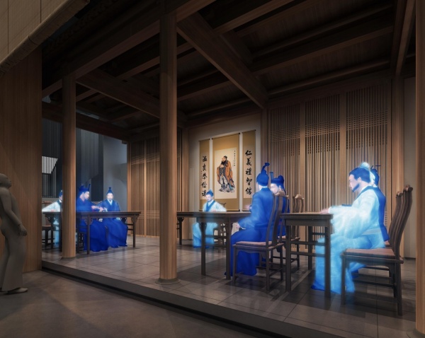 中正平和,成為“中庸之道”的主要內(nèi)涵和重要體現(xiàn),展館空間結(jié)合建筑軸網(wǎng)安排,形成中正平和,有序組織的空間布局形態(tài),成為設(shè)計理念在空間設(shè)計上的體現(xiàn)。整體設(shè)計以柔和的和諧氛圍呈現(xiàn),弱化設(shè)計形態(tài)、色調(diào),材質(zhì)上的互沖,體現(xiàn)儒學(xué)所蘊含的和善思想與和合精神。